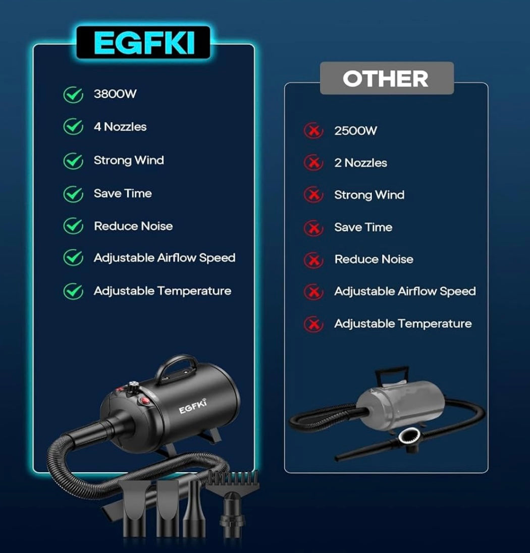 • Durable, heat-resistant hose: Stretchable composite hose stays flexible even with wiggle-pups What’s Included • EGFKI high-velocity dryer unit