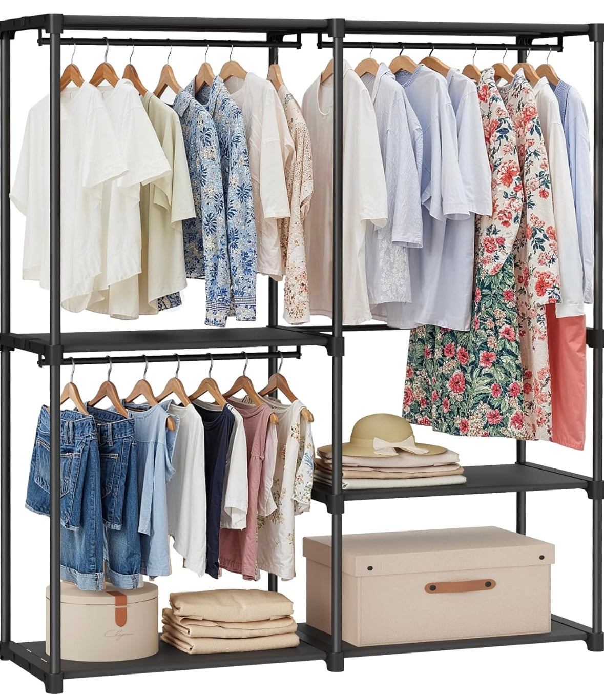 💪 Robust & Stable – Built from thick steel tubes and reinforced plastic connectors, each fabric shelf supports up to 22 lb, and each hanging rod holds up to 44 lb.