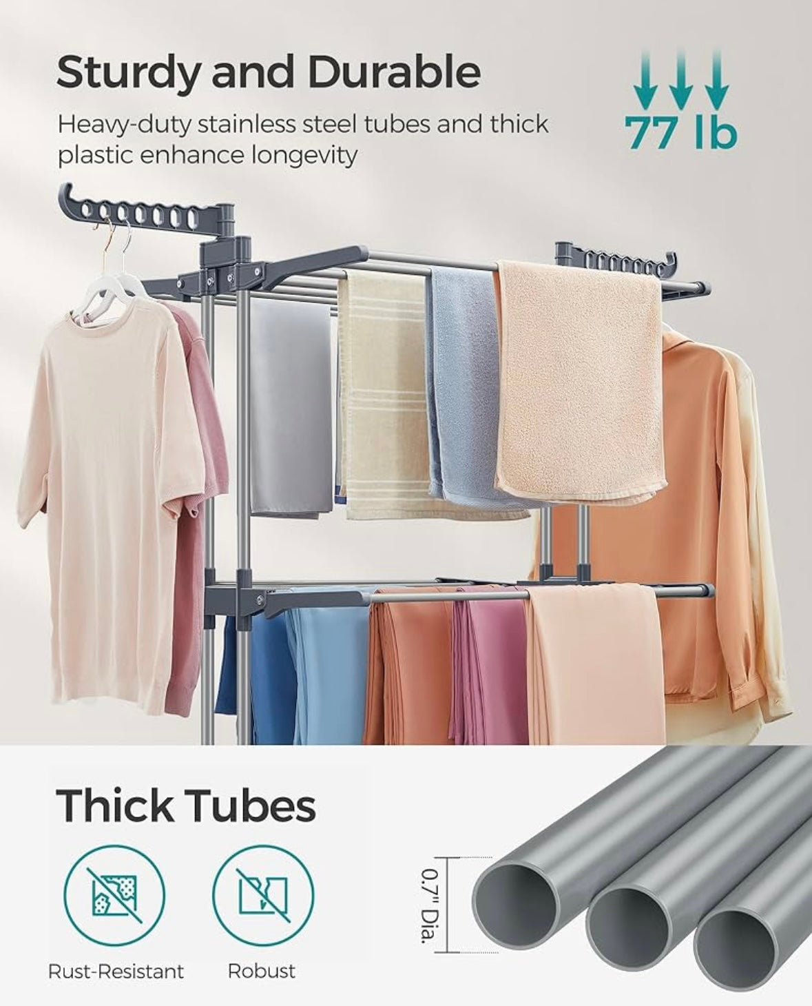 - 👕 Large Capacity: Features 3 upper tiers, 2 rotating wings with 14 slots, and a lower shelf for shoes or delicates — ideal for towels, sheets, and full loads of laundry.