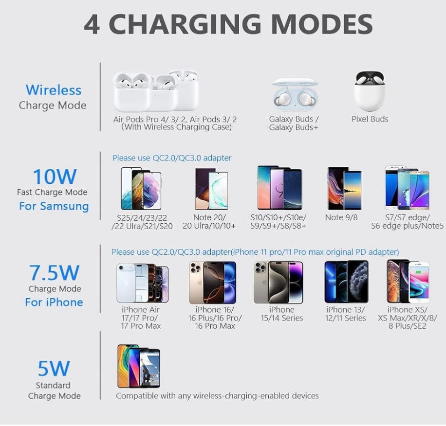 Multiple Charging Modes: Supports 7.5W, 10W, and 5W wireless charging for a wide range of devices.